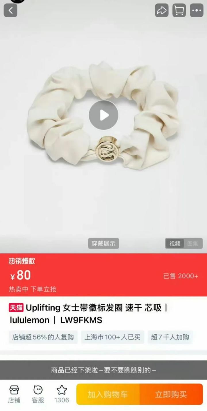 Lululemon官方店铺页面显示,这款带徽标的发圈饰边材质为100%锌合金,主体材质为86%聚酯纤维和14%氨纶。