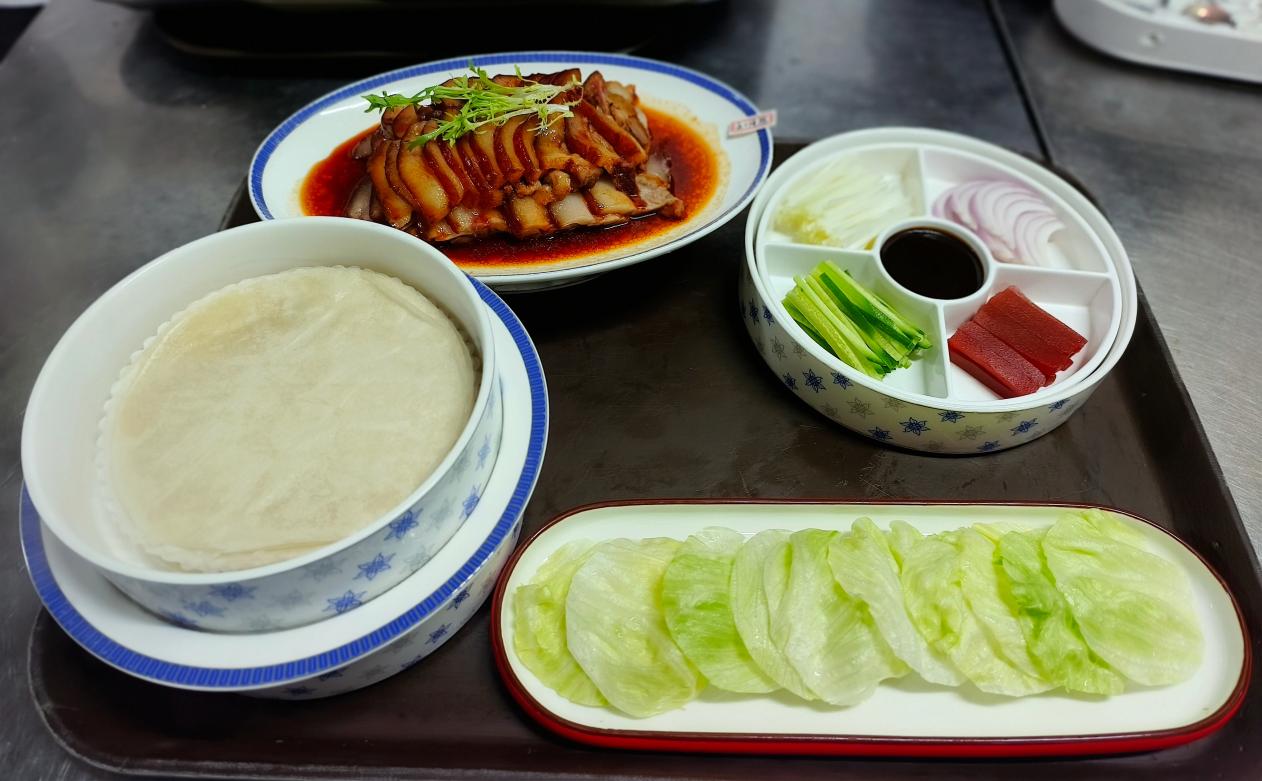 江夏区推荐的金口烧腊,吃法类似片皮鸭:将烧腊放在荷叶饼上,搭配生菜,佐以甜面酱、葱条、黄瓜条等,卷起食用,满口鲜香。