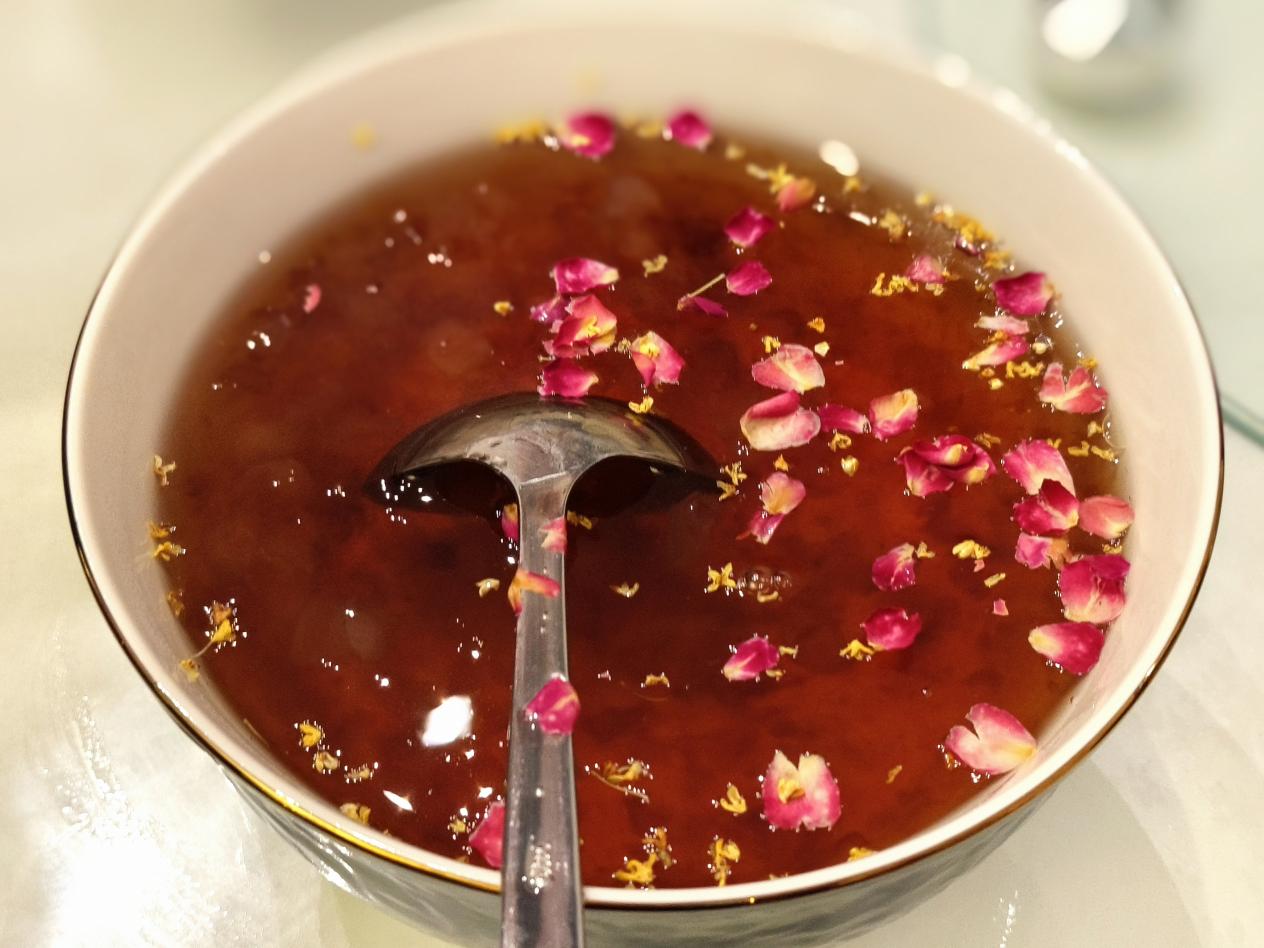 新洲区的桃胶养颜羹晶莹剔透、滑润软糯,成为现场女士们的心头好。新洲三店宋寨村盛产桃树,桃胶资源丰富,当地人将桃胶与皂角米、银耳、红枣、枸杞等滋补食材搭配,以文火慢炖制成这道甜品,清甜滋润,既传承了中医“药食同源”的理念,又满足了消费者对美味与健康的双重追求。