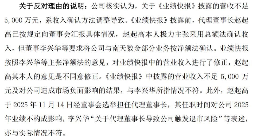 关于《业绩快报》披露的营收不足5000万元,系收入确认方法调整导致。业绩快报按照李兴华等主张净额法的意见,对业绩快报中的营业收入进行了修正,赵起高其本人的意见是不同意修正。