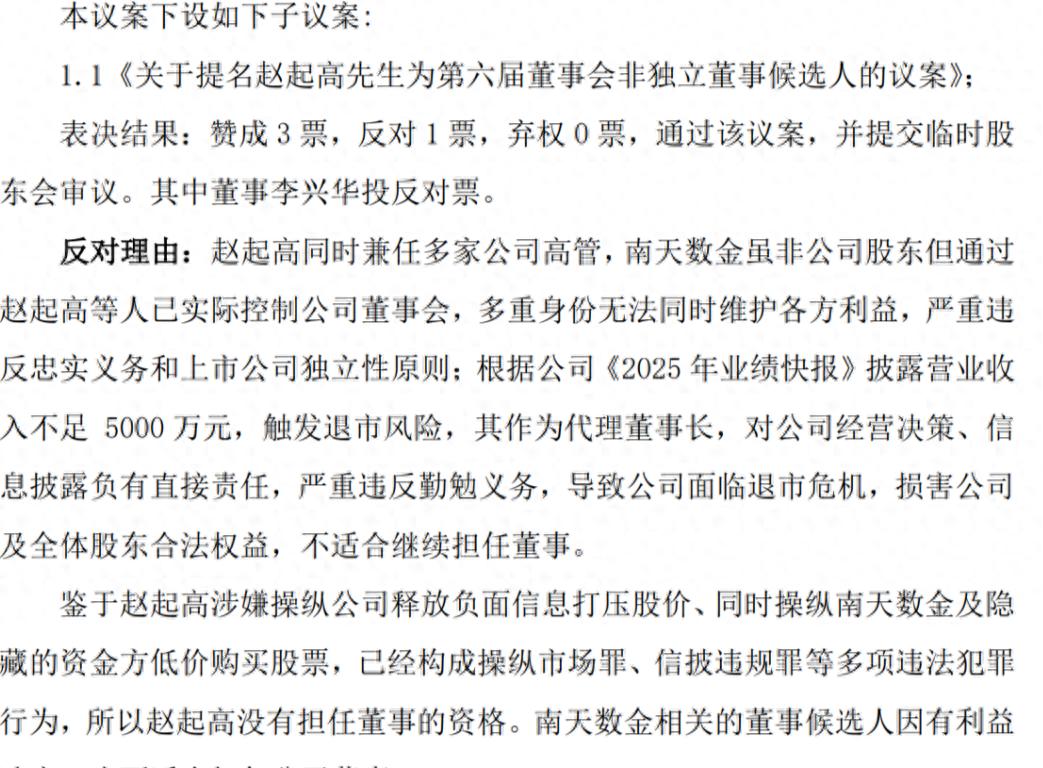 鉴于赵起高涉嫌操纵公司释放负面信息打压股价、伙同南天数金及隐藏资金方低价收购股票,已构成操纵市场罪、信披违规罪等多项违法犯罪行为,严重损害公司独立性及中小股东利益;其作为代理董事长对公司经营不善及退市危机负有直接责任,不具备继续担任董事的资格。李兴华表示已对赵起高启动刑事控告,将整理材料后向公安机关报案。
