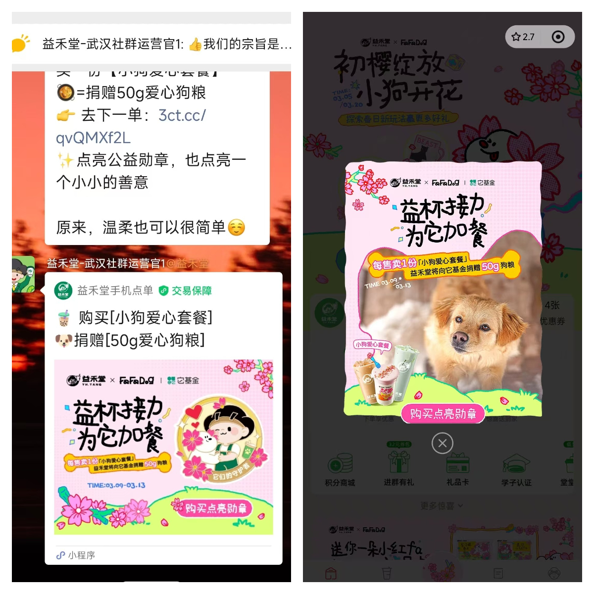 而这场“治愈”叙事中,最温暖的注脚来自公益。樱花季期间,益禾堂联动@它基金推出“小狗爱心套餐”,每售出一份即向流浪动物捐赠50g狗粮。有用户在晒单中写道:“买一杯奶茶,能让自己开心,还能让流浪小狗吃顿饱饭,这大概是春天最划算的治愈。”——这句话,或许正是益禾堂想传递的:真正的治愈,是让温暖流动起来。