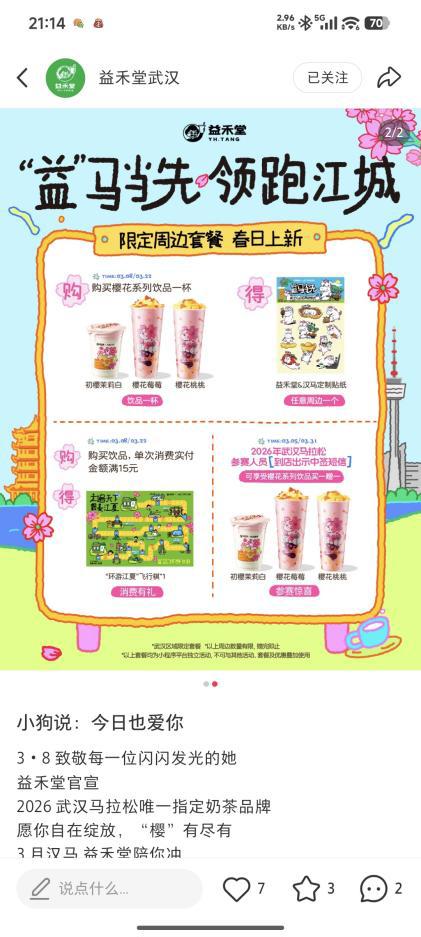 作为2026武汉马拉松的赛事合作伙伴,益禾堂于3月8日推出“益马当先”汉马限定套餐。套餐内含樱花季人气饮品及优惠券包,为即将于3月22日鸣枪起跑的3万名跑者提前送上春日能量。