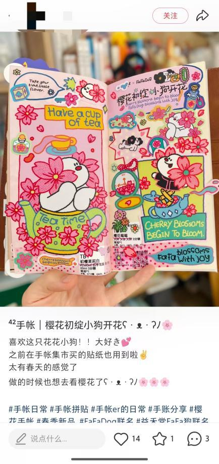 当FaFaDog的大耳朵化为樱花,在纸杯、塑杯、保温袋上“盛开”,这套“会开花”的包材迅速成为年轻人的“晒单标配”。有用户晒出贴满FaFaDog贴纸的樱花手账本。有人将贴纸贴在电脑、手机壳、行李箱上,凑成一套“春日限定皮肤”。