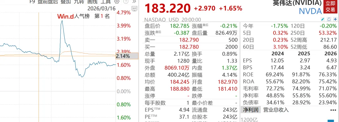 黄仁勋发表演讲后,英伟达股价应声大涨,盘中最高涨4.31%,截至收盘涨1.65%。