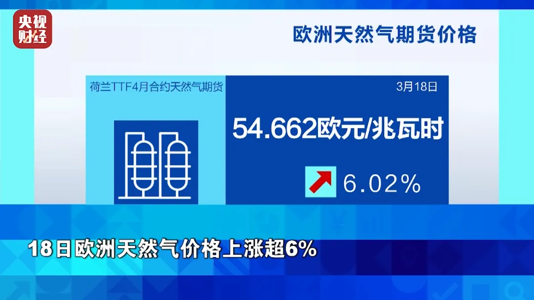 周三,欧洲天然气价格也应声上涨。截至收盘,作为欧洲市场基准的荷兰TTF天然气期货4月合约价格收于每兆瓦时54.662欧元,上涨6.02%。