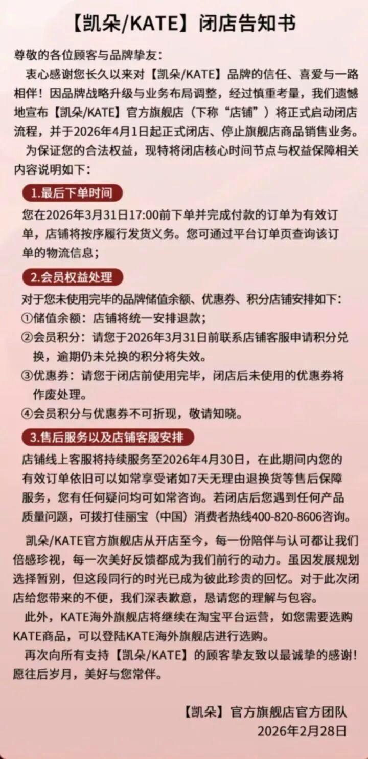 近日,花王集团旗下经典彩妆品牌KATE凯朵,接连在抖音官方旗舰店、天猫官方旗舰店发布闭店告知书,宣布店铺将于2026年4月1日起正式闭店。消息一出,瞬间在社交平台掀起了一场集体怀旧热潮,无数网友直呼“我的青春结束了”。