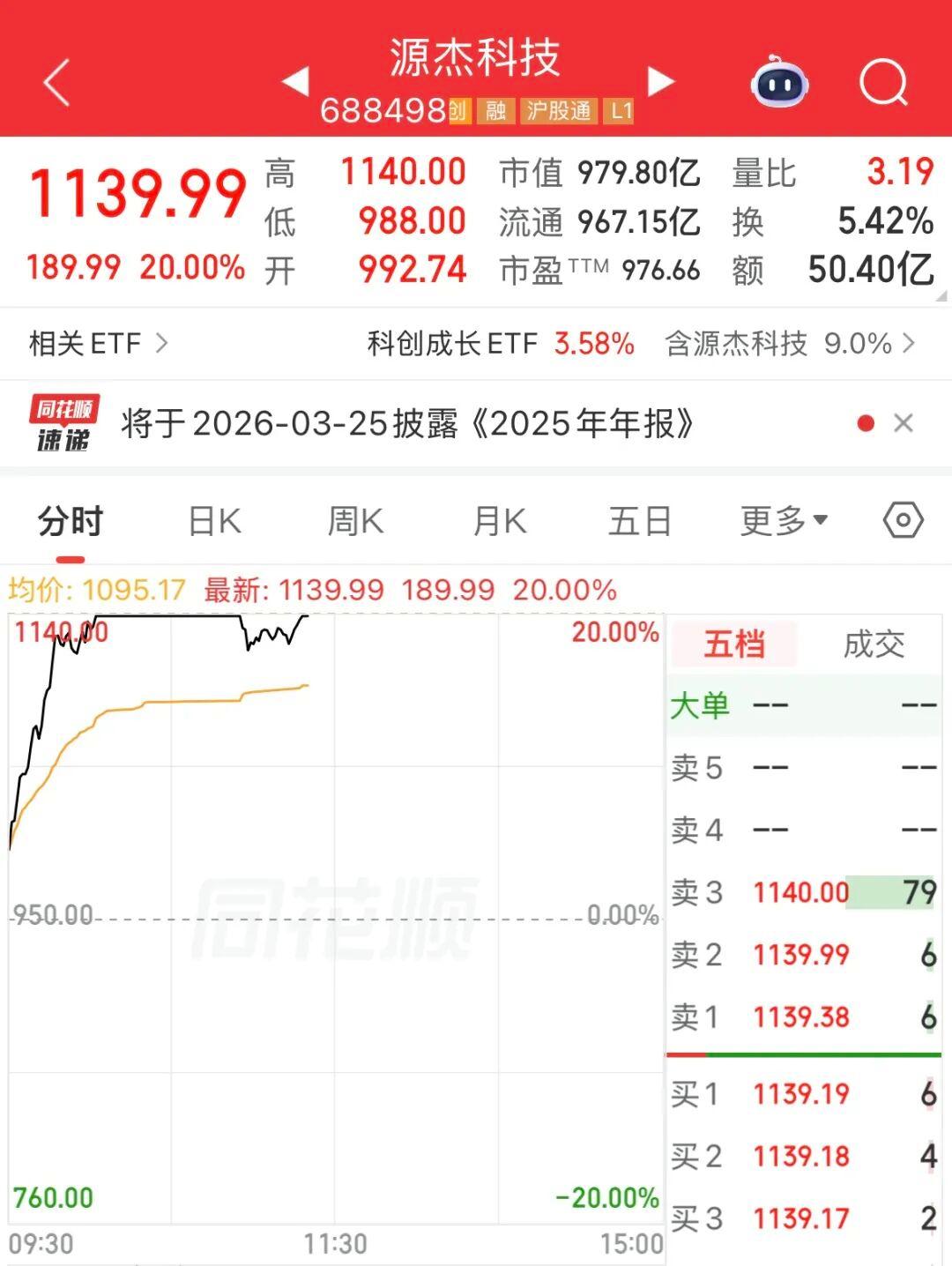 3月20日,光芯片龙头源杰科技盘中股价接连突破1000元、1100元关口,并触及20%涨停,正式迈入“千元股”行列,成为A股历史上第八只千元股。与此同时,公司股价超越寒武纪,跃居A股第二高价股,仅次于“股王”贵州茅台。
