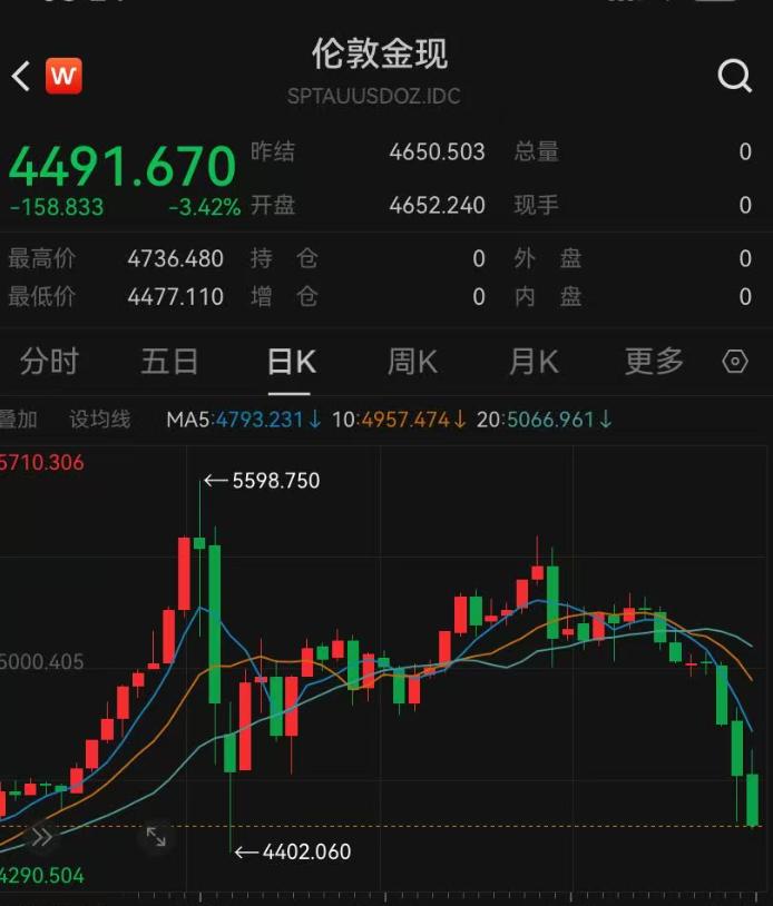 周五,国际贵金属价格普遍收跌,黄金跌破4500美元关口,其中,现货黄金跌3.42%,报4491.67美元/盎司;COMEX黄金期货跌2.47%,报4492.00美元/盎司。