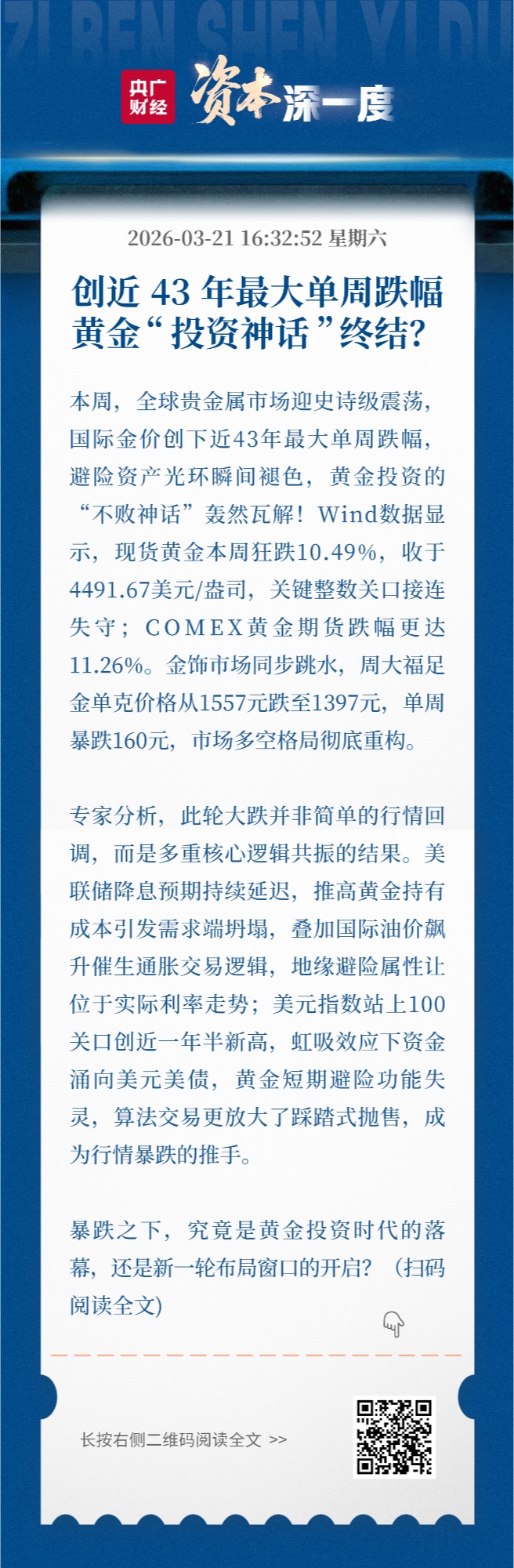 央广网北京3月21日消息(记者邹煦晨)全球贵金属市场迎来一轮惨烈行情。本周,国际金价遭遇史诗级暴跌,创下1983年3月以来的近43年最大单周跌幅纪录,此前持续上行的强势走势就此终结,引发全球金融市场高度关注。