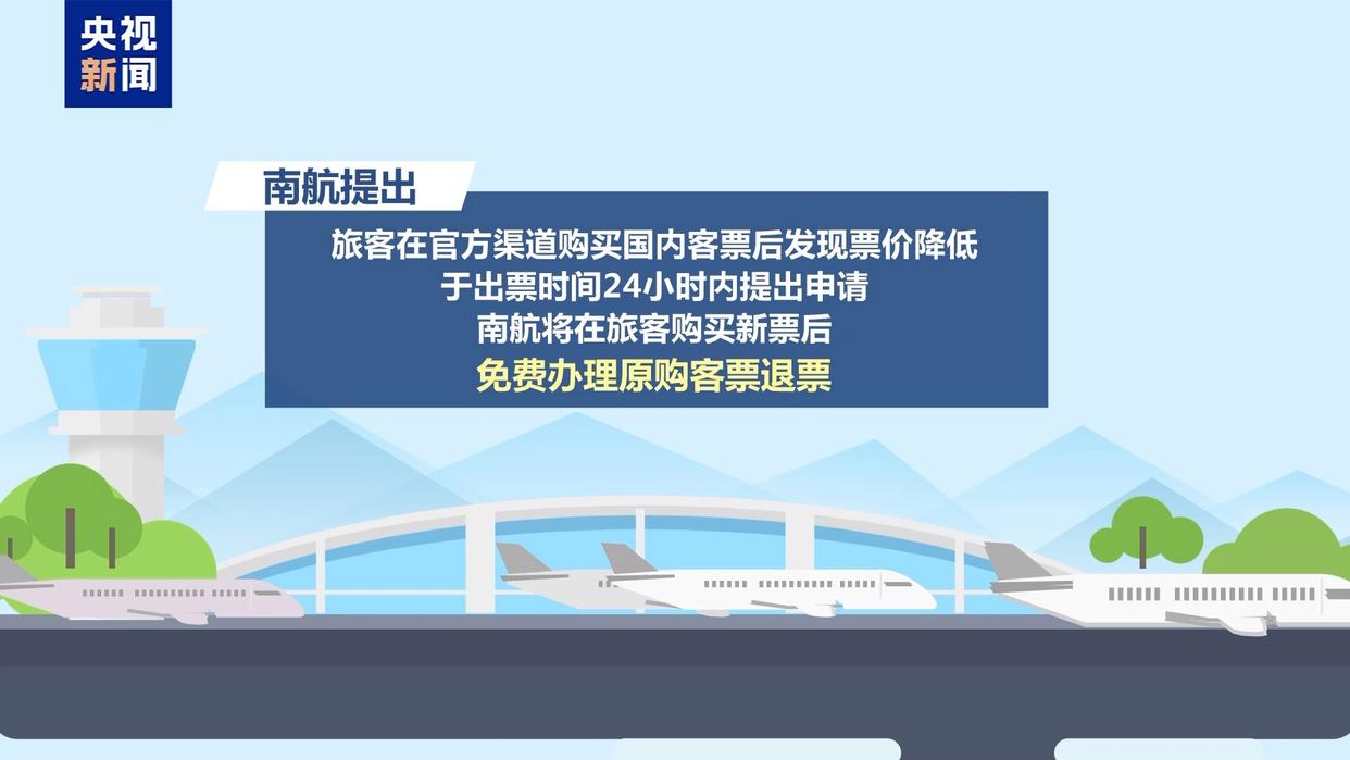 南航提出:旅客在官方渠道购买国内客票后发现票价降低,于出票时间24小时内提出申请,南航将在旅客购买新票后,免费办理原购客票退票。