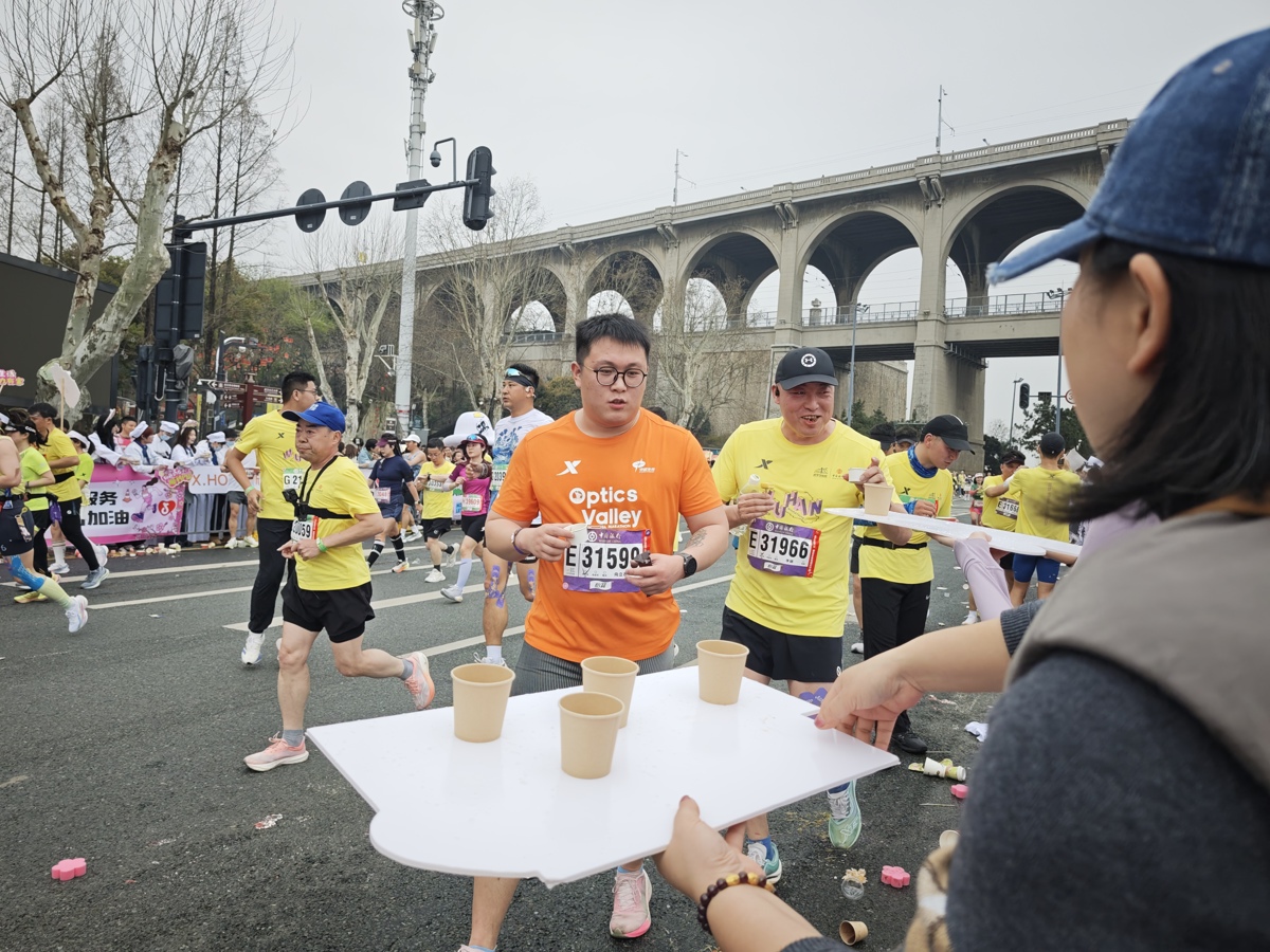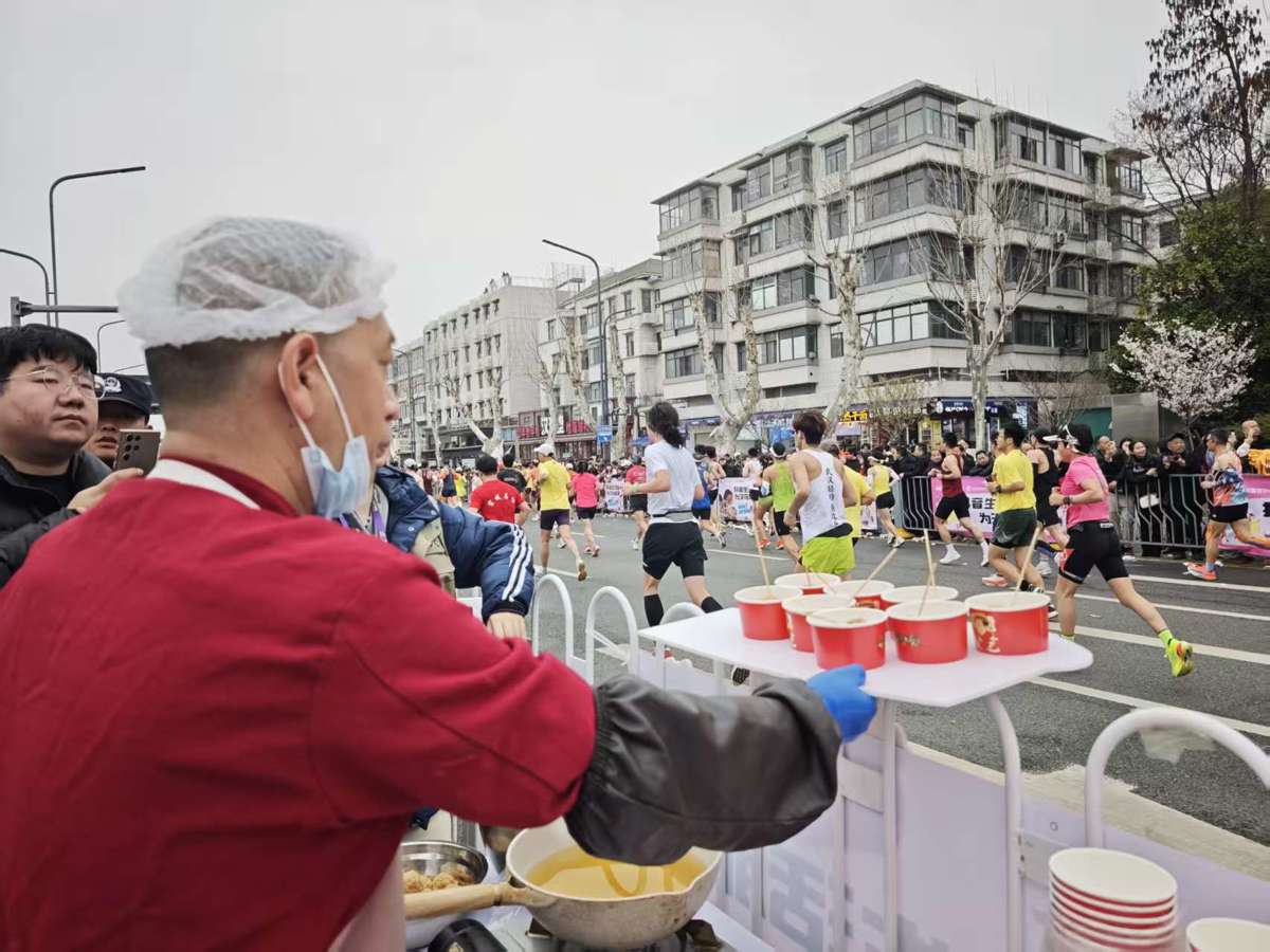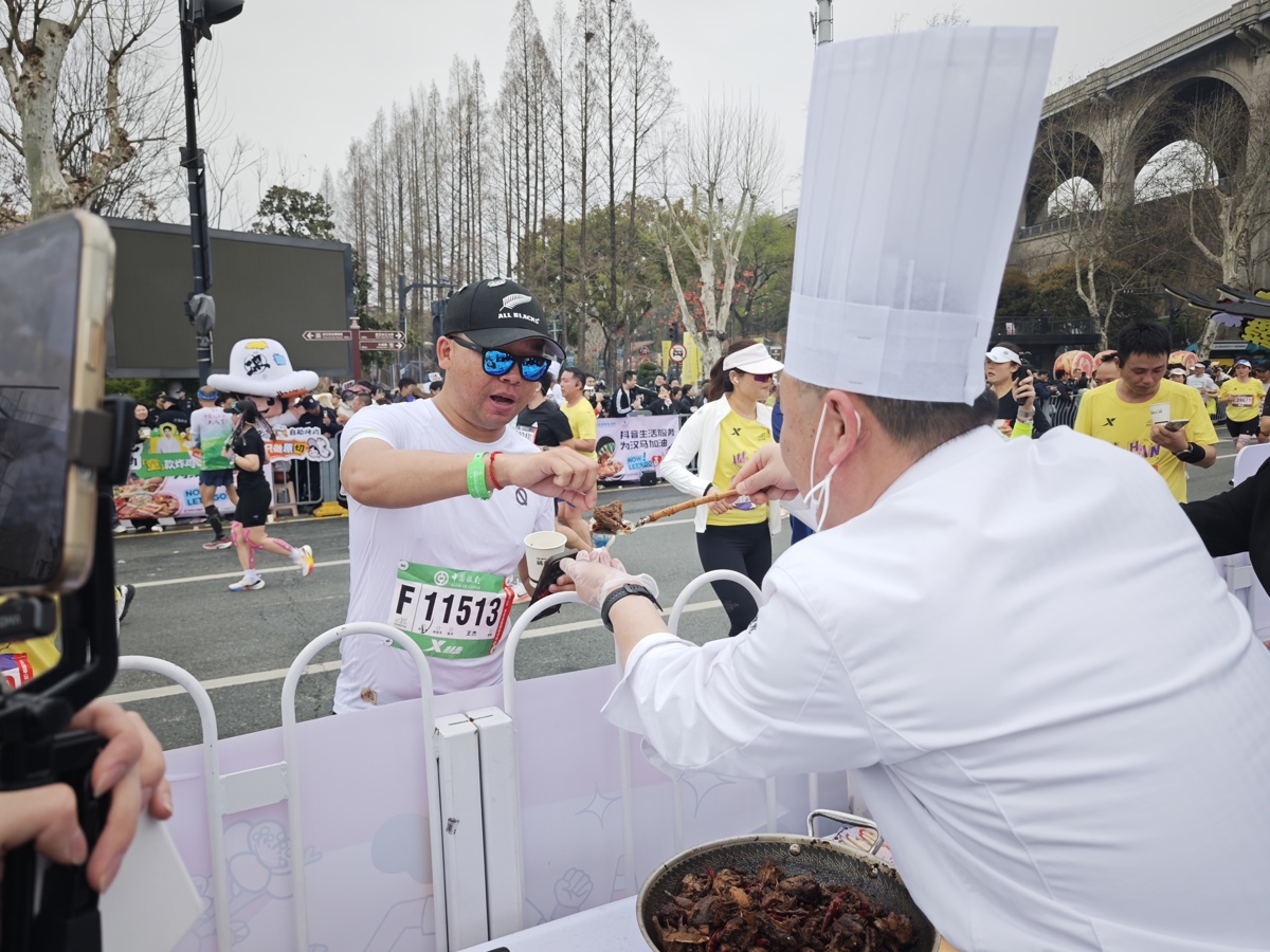 开跑后约40分钟,第一批选手经过汉阳门码头,补给点顿时热闹起来。很快,随着大部队陆续到达,人们一边给选手们加油,一边递上自己精心准备的美食。美食的香味和热情的吆喝,吸引不少选手停下脚步,驻足品尝。