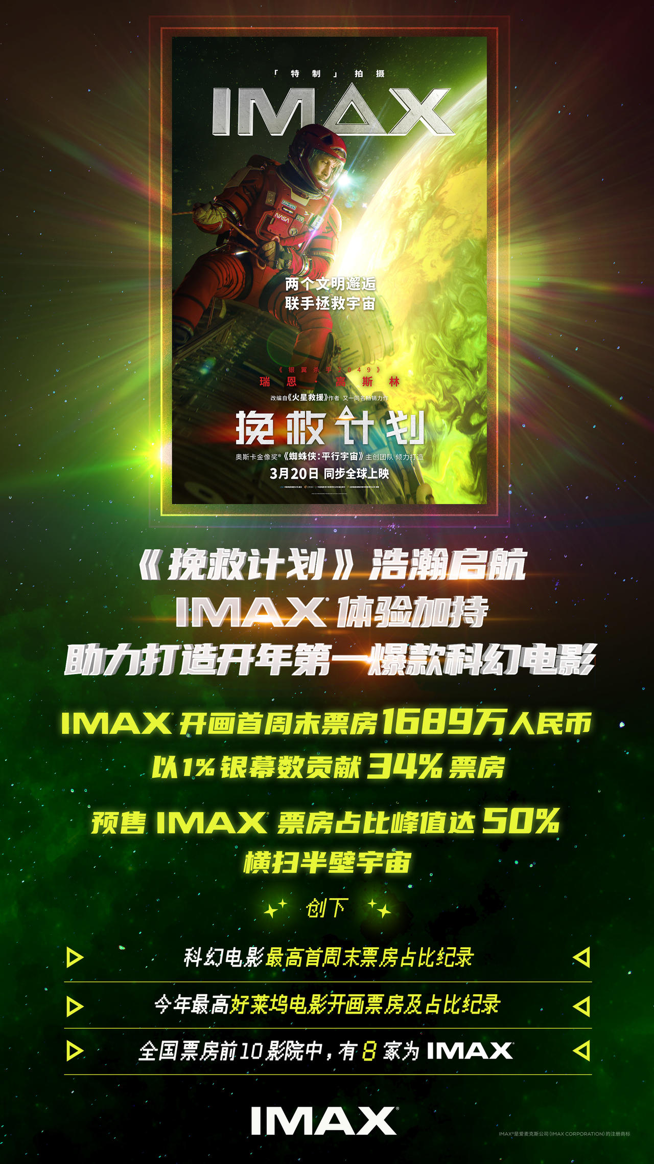 3月23日,上海。IMAX China (港交所:1970)宣布,采用IMAX特制拍摄的科幻巨制《挽救计划》在中国市场表现强劲,开画首周末,IMAX斩获1689万元人民币票房,以约1%的银幕数贡献34%票房,创下科幻电影历史最高首周末占比,同时也是2026年好莱坞影片在中国的最高IMAX开画票房和占比。