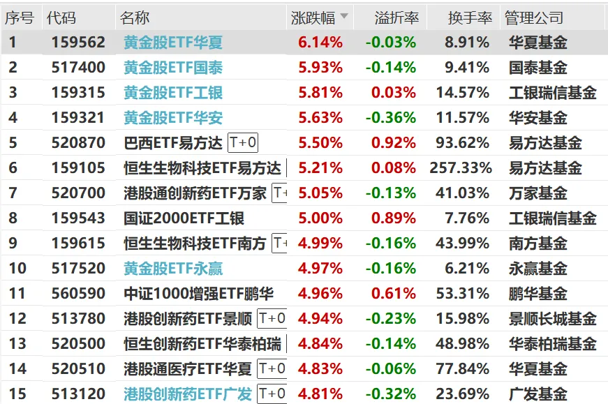 其中,多只黄金股ETF领涨全市场;跨境品种中,巴西ETF易方达涨5.50%;港股医药板块大幅反弹,恒生生物科技ETF易方达涨5.21%,港股通创新药ETF万家涨5.05%。
