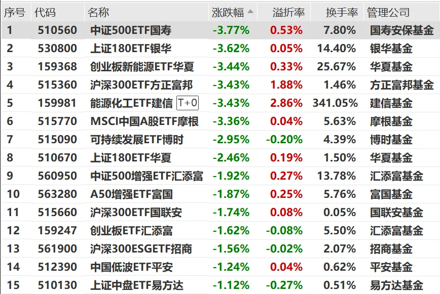 跌幅方面,部分宽基及周期类ETF遭遇回调。比如中证500ETF跌3.77%,上证180ETF跌3.62%,创业板新能源ETF跌3.44%。