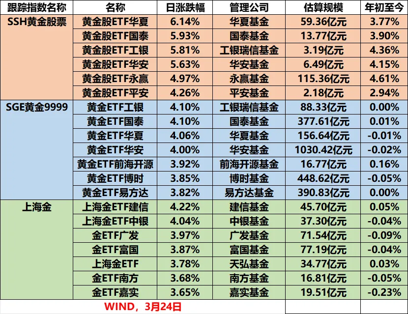 3月24日,黄金股、黄金相关ETF霸屏涨幅榜。其中,黄金股ETF华夏涨6.14%,国泰、工银、华安旗下黄金股ETF均涨超5%。