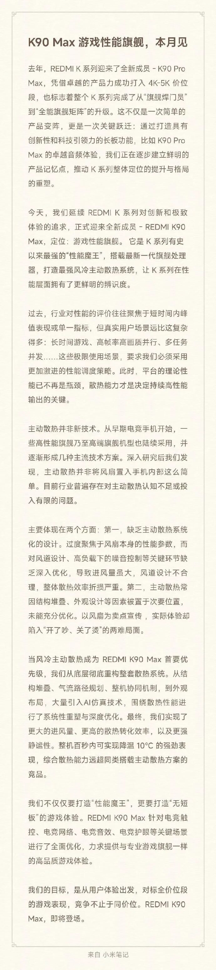 4月7日,小米集团合伙人、总裁、手机部总裁卢伟冰发文宣布,REDMI K系列全新成员,K90 Max,定位游戏性能旗舰,将于本月发布。卢伟冰称:我们的目标是,从用户体验出发,对标全价位段的游戏表现,竞争不止于同价位。K90 Max 即将登场,敬请期待。