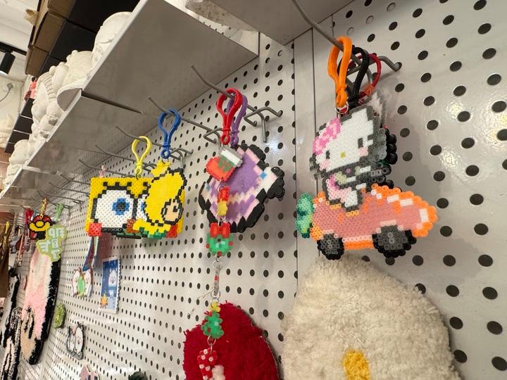 在上海市一家手工坊内的展示墙上,挂着各式各样的拼豆挂件。新华社记者程思琪 摄