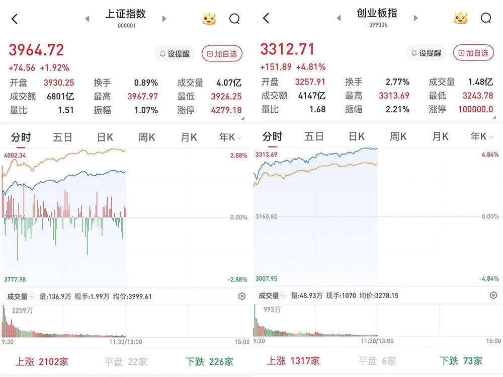 至午间收盘,上证综指涨1.92%,报3964.72点;深证成指涨3.87%,报13919.13点;创业板指涨4.81%,报3312.71点。