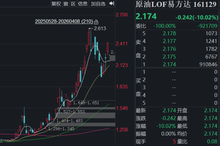 此外,为了防止投资者过热交易,大多原油挂钩的LOF基金普遍将开盘时间调整为当日10:30复牌,以压缩投资者的交易时间。不过,即便如此,仍然有不少押注石油价格持续上涨的投资者涌入相关基金,即便算上今日的跌停,原油LOF易方达的溢价率仍高达27%。