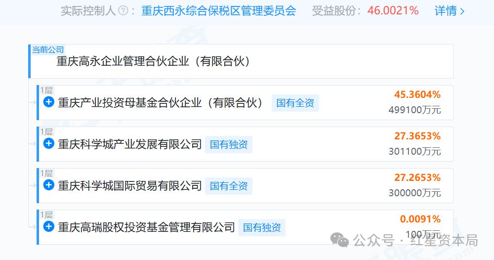 值得注意的是,重庆高永背后是重庆地方国资的身影。重庆高永成立于2023年3月,注册资本为100.03亿元。公司股东包括重庆产业投资母基金合伙企业(有限合伙)、重庆科学城投资控股有限公司、重庆西永产业发展有限公司、重庆高瑞股权投资基金管理有限公司(以下简称重庆高瑞)。