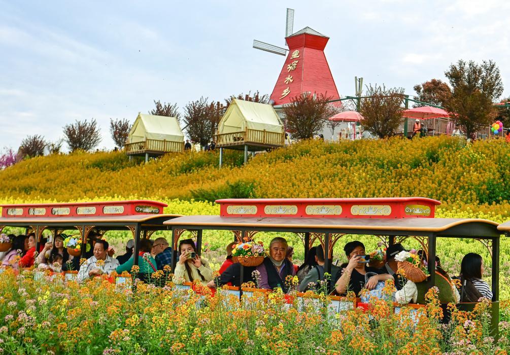 3月27日,游客在汉中市汉台区老君镇黄塘村黄塘水乡景区乘坐小火车观光游览。新华社记者 邹竞一 摄