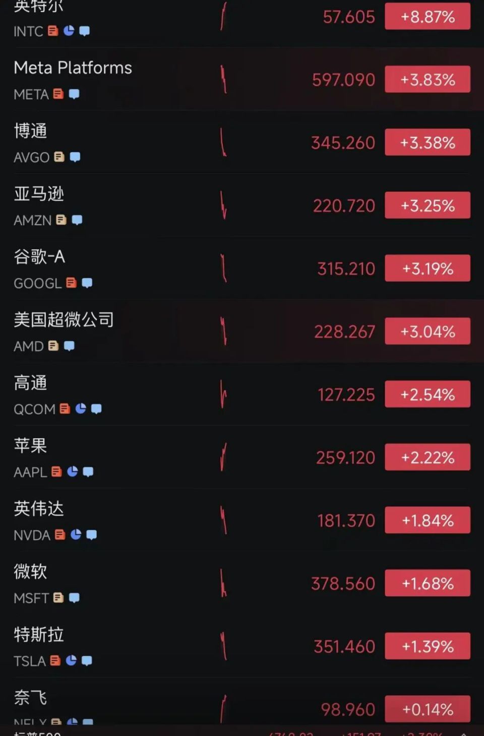 大型科技股集体反弹,英特尔涨超8%,Meta Platforms 涨超3.8%,亚马逊涨超3.2%,谷歌-A股价涨超3.1%,ADM涨超3%,苹果、苹果涨超2%,英伟达涨超1.8%,微软上涨1.68%,特斯拉上涨1.39%。