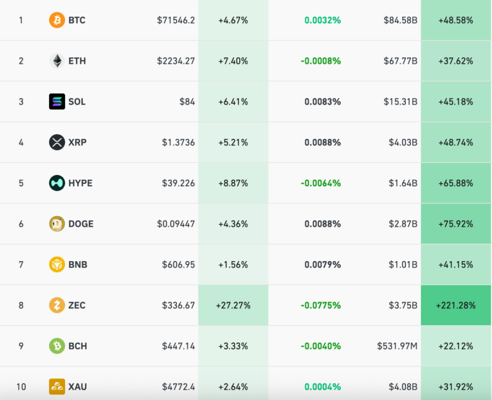 加密货币主要币种集体上涨,截至发稿,比特币涨至7.1万美元/枚,涨幅超4.6%,以太坊、SOL、XRP、狗狗币等均大幅上涨。