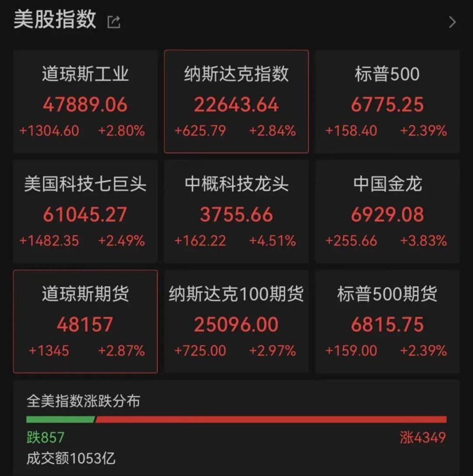 截至发稿,道指涨1304点,涨幅达2.8%;纳指涨2.84%,标普500指数涨2.39%。4349只个股上涨,857只个股下跌。