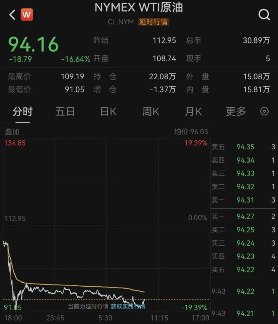 WTI原油期货一度跌超19%,截至发稿,跌幅为16.64%,报94.16美元/桶;布伦特原油期货一度跌超17%,截至发稿,跌幅为15.27%,报92.58美元/桶。