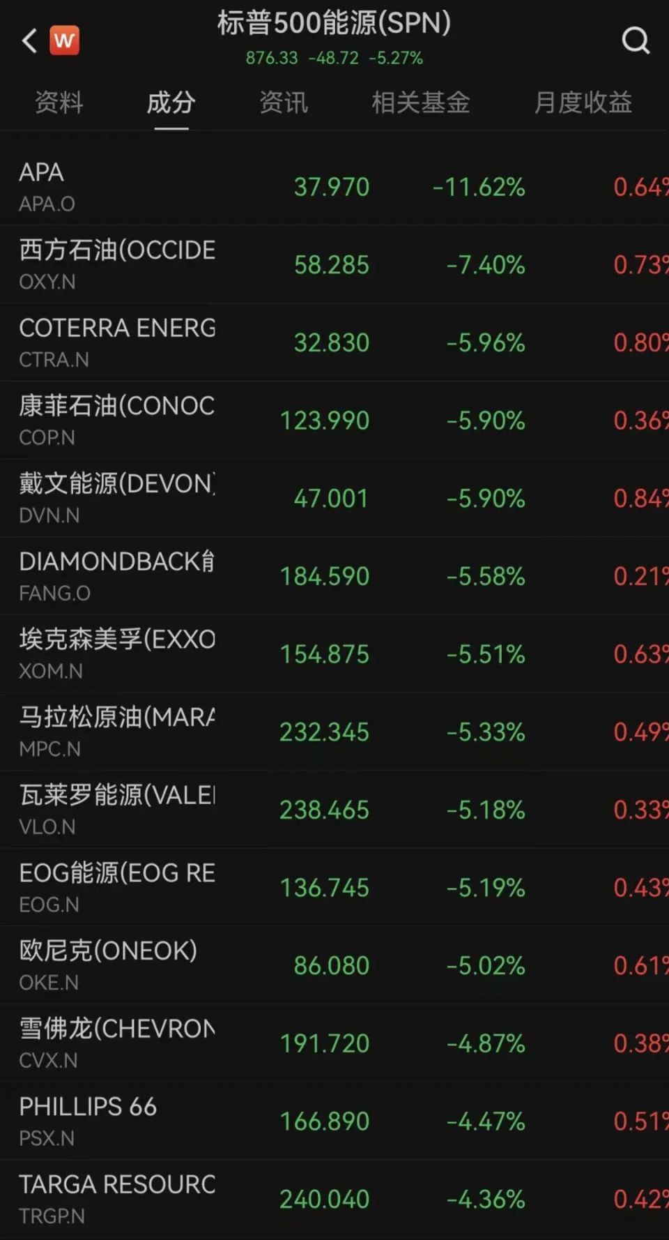 标普500能源指数下跌5.27%。埃克森美孚下跌5.51%,雪佛龙下跌4.87%,西方石油下跌7.4%,APA下跌超11%。