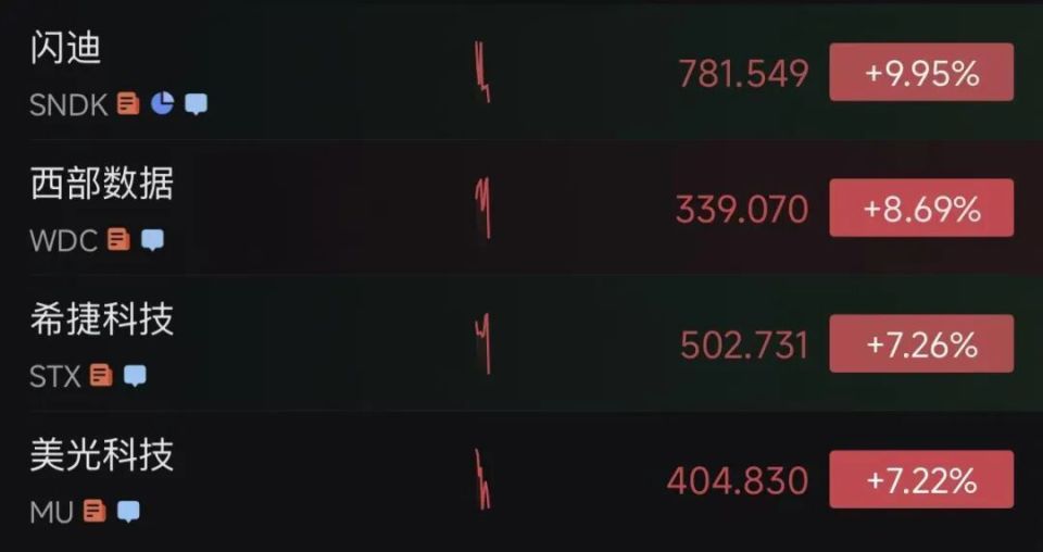 芯片存储板块普涨,闪迪高开高走,涨近10%。戴尔CEO表示,AI内存需求将激增625倍,供给短缺将持续数年。西部数据涨超8.6%,希捷科技、美光科技涨超7%。