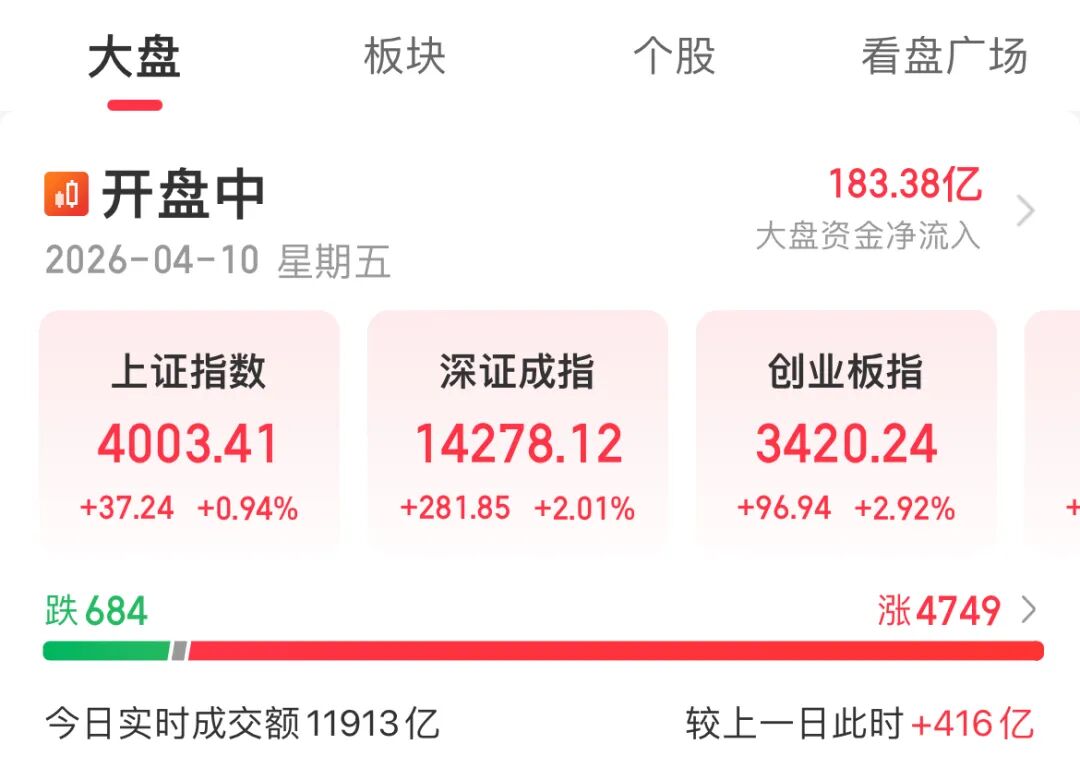 4月10日,A股三大指数集体高开,上证指数盘中突破4000点。