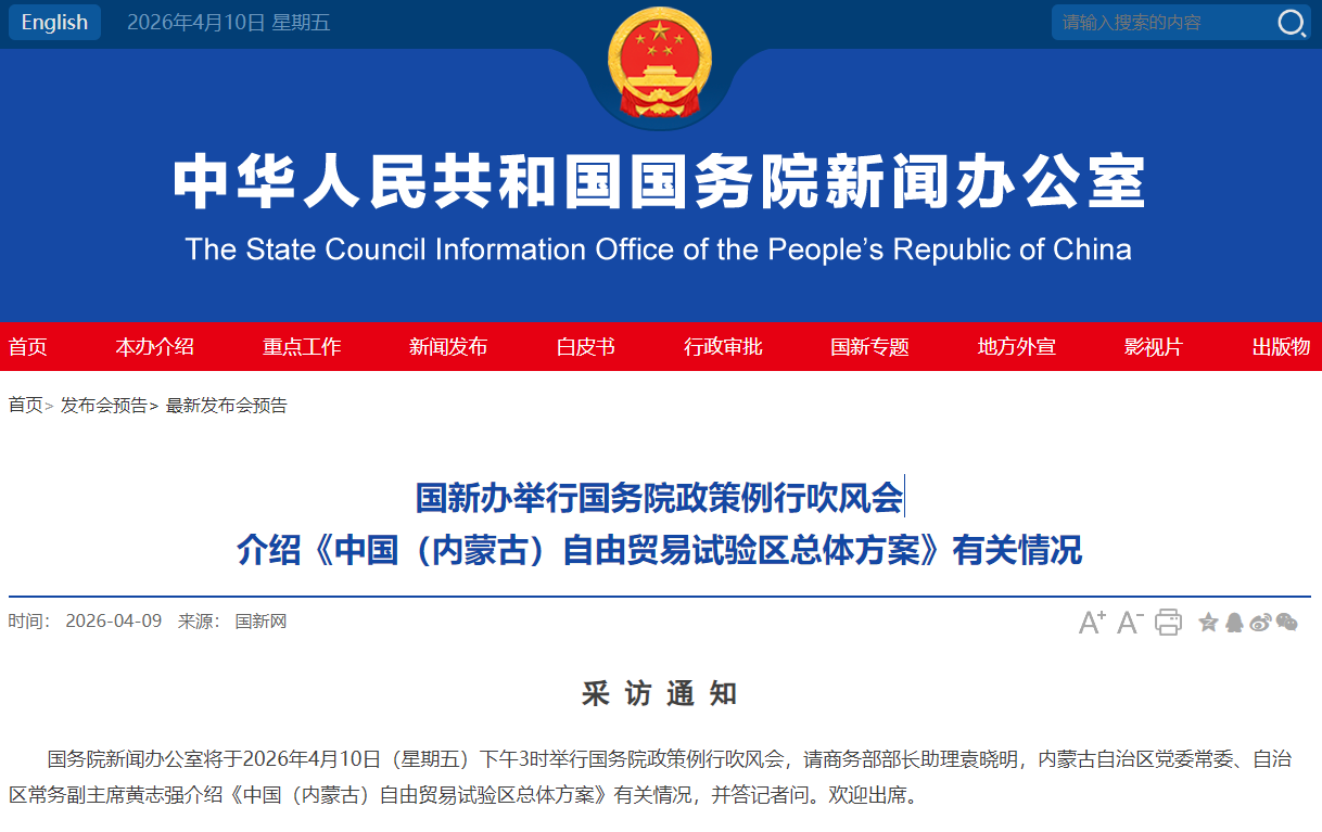 国务院日前印发《中国(内蒙古)自由贸易试验区总体方案》,并于昨晚正式对外公布。至此我国自贸试验区扩围至23个。今天(4月10日)下午,国务院新闻办公室将举行政策例行吹风会,商务部、内蒙古自治区相关负责人介绍《方案》有关情况。