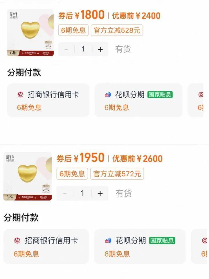 0.7克左右的爱心转运珠,10日原价2600元,券后1950元;11日原价降至2400元,券后1800元,又便宜了150元。