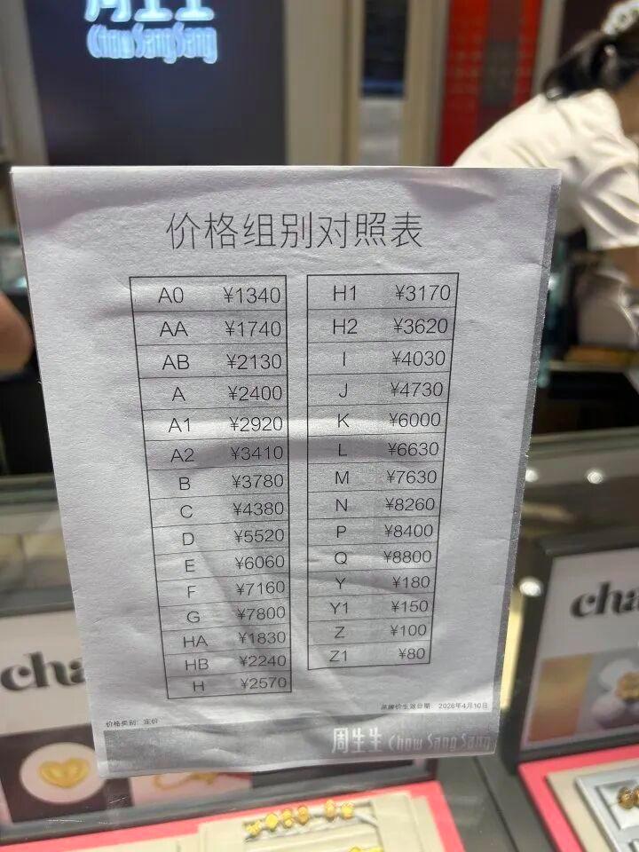 在杭州城西银泰的周生生柜台,转运珠的价目表已经更新。店员表示是临时调价,专柜部分老款打8折,新款8.8折。因为是临时通知,新的价目表还是用A4纸打印的,简单地贴在旧价目表上。