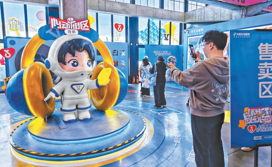 歌迷在THE BOX打卡“小北斗”雕塑。本报记者 方非摄