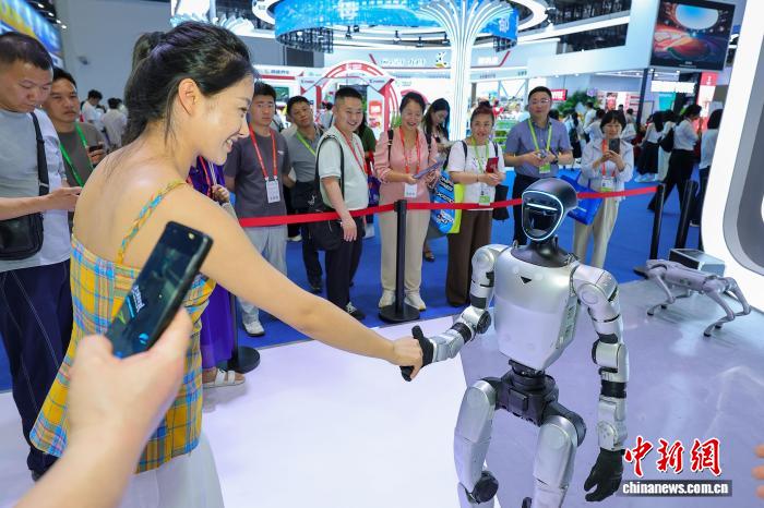 4月13日,第六届中国国际消费品博览会在海南海口举办。多款智能机器人集中亮相展会现场,凭借前沿科技与创新应用吸引不少参观者驻足观看、互动体验。图为一台宇树科技的人形机器人与参观者握手互动。中新社记者 骆云飞 摄