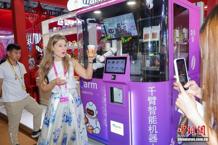 4月13日,第六届中国国际消费品博览会在海南海口举办。多款智能机器人集中亮相展会现场,凭借前沿科技与创新应用吸引不少参观者驻足观看、互动体验。图为一位外籍网络主播在品尝智能机器人制作的咖啡。中新社记者 骆云飞 摄