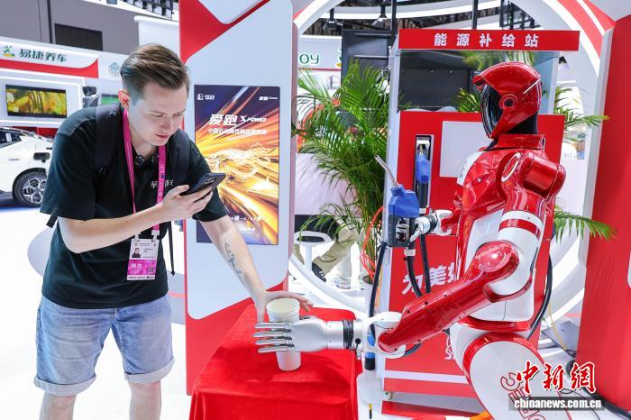 4月13日,第六届中国国际消费品博览会在海南海口举办。多款智能机器人集中亮相展会现场,凭借前沿科技与创新应用吸引不少参观者驻足观看、互动体验。图为一位外籍网络主播与一台智能服务机器人互动。中新社记者 骆云飞 摄