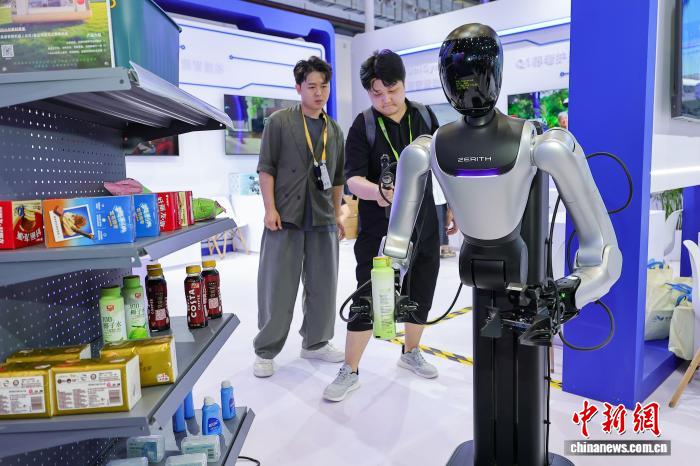 4月13日,第六届中国国际消费品博览会在海南海口举办。多款智能机器人集中亮相展会现场,凭借前沿科技与创新应用吸引不少参观者驻足观看、互动体验。图为一款轮立式机器人在展示抓取货物。中新社记者 骆云飞 摄