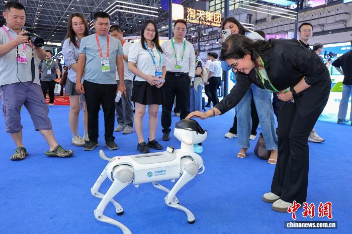 4月13日,第六届中国国际消费品博览会在海南海口举办。多款智能机器人集中亮相展会现场,凭借前沿科技与创新应用吸引不少参观者驻足观看、互动体验。图为一位外籍参观者与展出的机器狗互动。中新社记者 骆云飞 摄