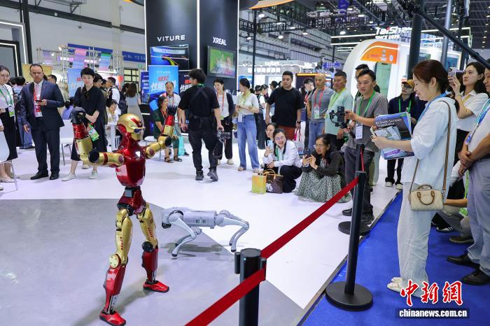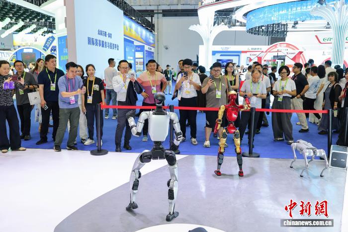 4月13日,第六届中国国际消费品博览会在海南海口举办。多款智能机器人集中亮相展会现场,凭借前沿科技与创新应用吸引不少参观者驻足观看、互动体验。图为宇树科技带来的机器人吸引参观者。中新社记者 骆云飞 摄