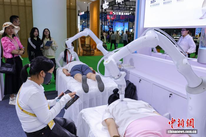 4月13日,第六届中国国际消费品博览会在海南海口举办。多款智能机器人集中亮相展会现场,凭借前沿科技与创新应用吸引不少参观者驻足观看、互动体验。图为参观者在展会现场体验一款按摩机器人。中新社记者 骆云飞 摄