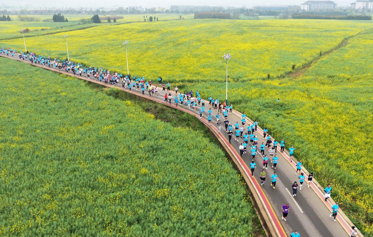 3月15日,2026曲靖罗平花海马拉松在罗平县鸣枪开跑(无人机照片)。新华社发(毛虹 摄)