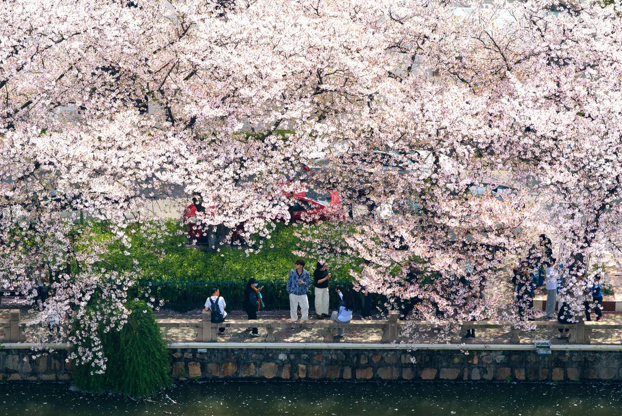 人们在江苏省常熟市的护城河畔赏花(无人机照片)。新华社发(杨素平 摄)