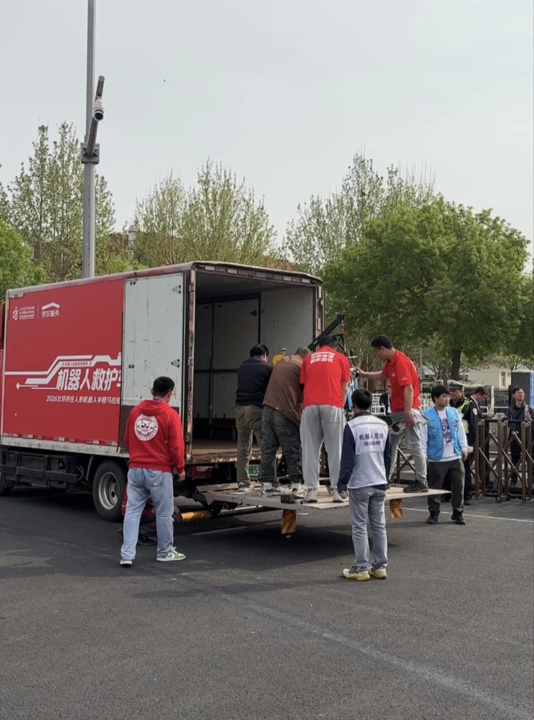 4月19日早上7时30分,2026北京亦庄半程马拉松暨人形机器人半程马拉松鸣枪起跑。上午8时许,极目新闻记者在现场看到,36号机器人在出发约300米后的第一个弯道发生意外摔倒,现场工作人员急忙将它抬到场边,尝试维修,却未能帮助它重返赛道。身旁,一台台人形机器人接连从它身旁掠过。9时左右,现场开来一辆机器人救护车,将36号机器人装上驶离现场。