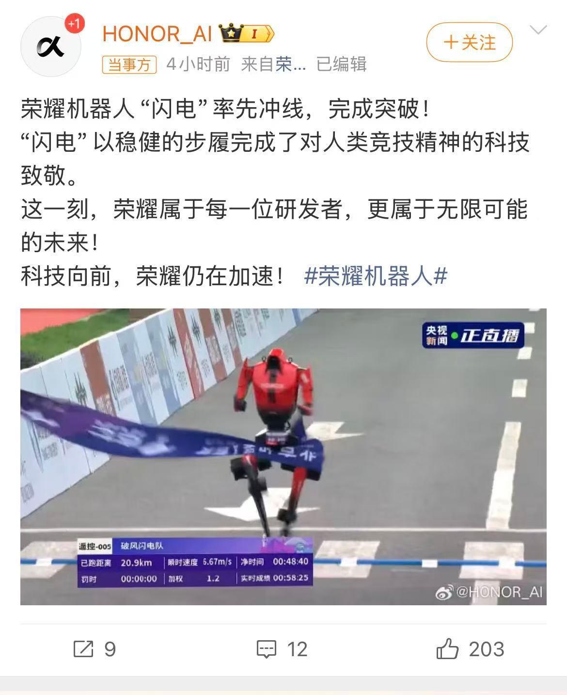 #荣耀机器人首次参赛就夺冠#的相关话题迅速冲上热搜。赛后HONOR_AI 官方发文表示,荣耀机器人“闪电”率先冲线,完成突破!“闪电”以稳健的步伐完成对人类竞技精神的科技致敬。这一刻,荣耀属于研发者,更属于充满可能的未来!科技向前,荣耀仍在加速!