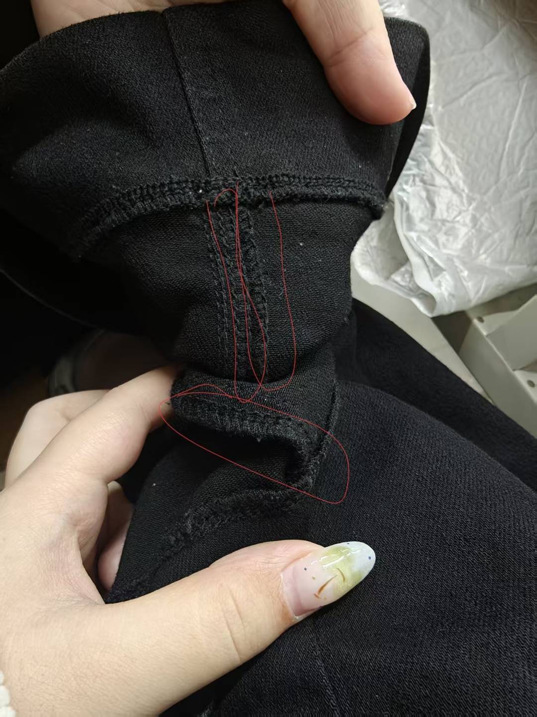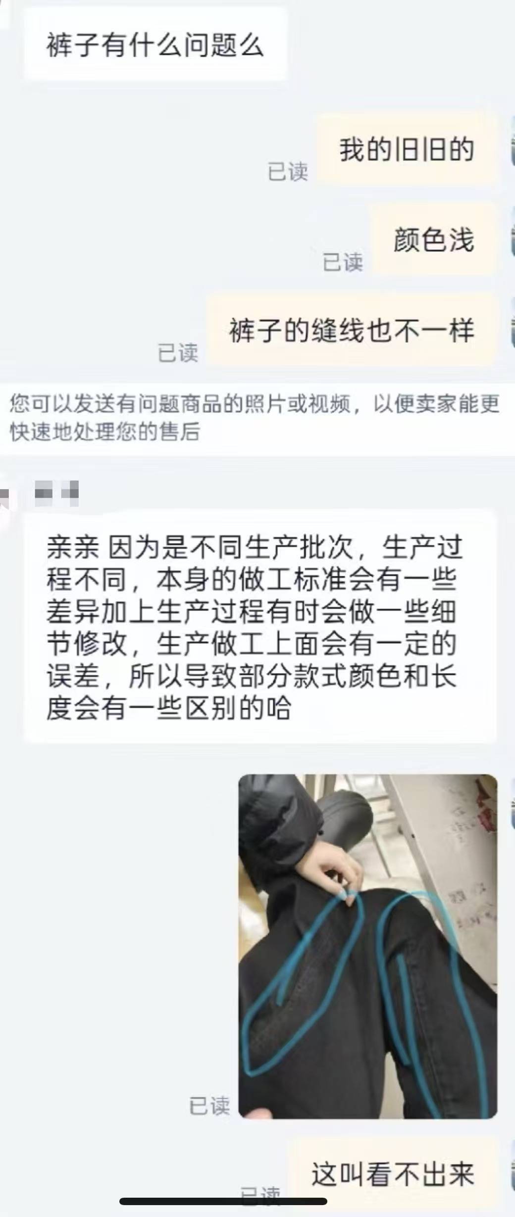 宋同学和舍友购买的同店同款裤子,舍友裤缝缝线为双排线,自己的是单排线