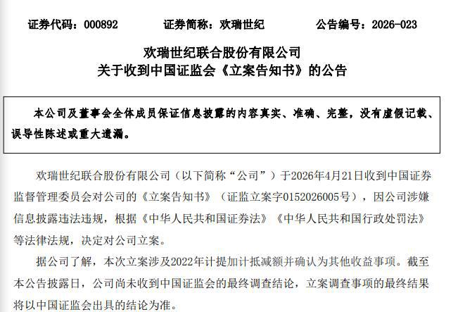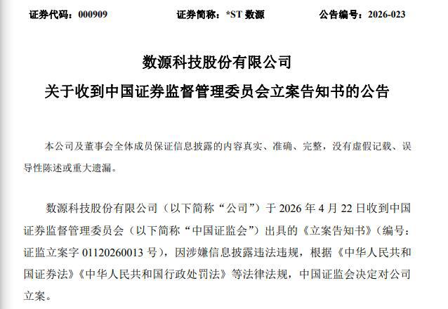 *ST数源的公告称,数源科技股份有限公司(以下简称“公司”)于2026年4月22日收到中国证监会 证券监督管理委员会(以下简称“中国证监会”)出具的《立案告知书》编号: 证监立案字01120260013 号,因涉嫌信息披露违法违规,根据《中华人民共和 国证券法》《中华人民共和国行政处罚法》等法律法规,中国证监会决定对公司立案。